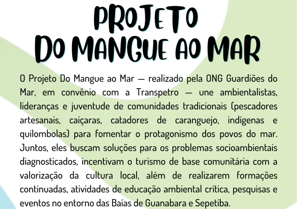 Atuando com conservação de manguezais e democratização de conhecimento sobre os ambientes costeiros marinhos, o projeto oferece pagamento de serviço ambiental para catadores de caranguejo e pescadores artesanais, via transferência de renda para trabalho de limpeza nos manguezais. Eles são importantes aliados no combate a emergências climáticas, além de oferecerem serviços ecossistêmicos que fomentam a socioeconomia e sociobiodiversidade local. Com um ano de atuação, o Projeto é parceiro oficial no Brasil para a Década das Nações Unidas para Restauração de Ecossistemas (2021-2030), do Programa das Nações Unidas para o Meio Ambiente (PNUMA) e um dos signatários do Plastic no Thanks, movimento que trabalha para mitigar as consequências da produção, do consumo e do descarte de plásticos. Se conecta, dessa forma, a outras grandes coalizões internacionais para a aprovação de um acordo juridicamente vinculativo sobre o uso de plásticos, através da Assembleia de Meio Ambiente da Organização das Nações Unidas.